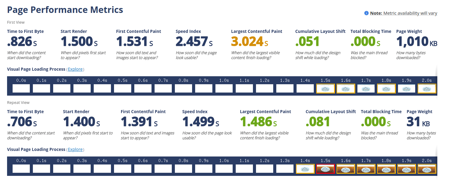 The WebPageTest comparison highlights clear improvements in server response time and visual loading metrics. Time to First Byte improved by nearly 46%, while Largest Contentful Paint dropped by 23%. These results reflect faster interactivity and smoother visual rendering, contributing to a more consistent and responsive user experience.
