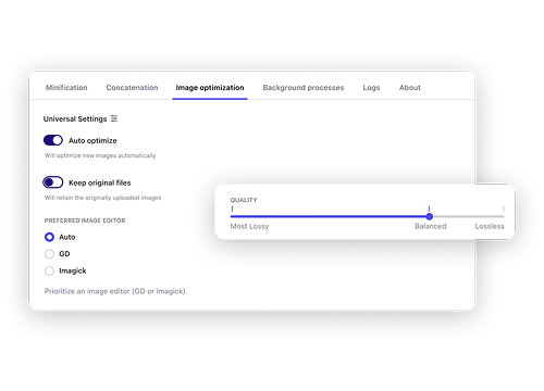 • Optionally keep original files for peace of mind (automatically restored if you remove the plugin)